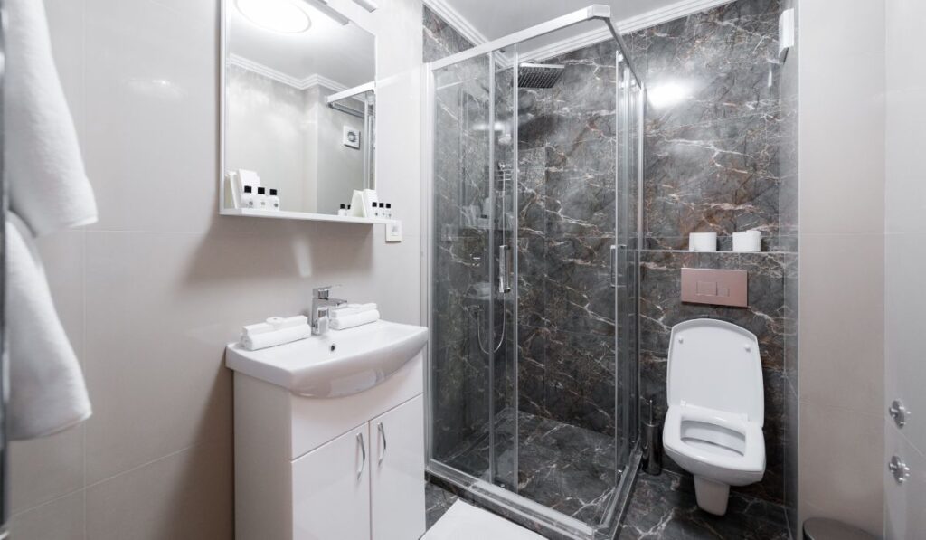 Svaka soba ima svoje kupatilo opremljeno tuš kabinom, kupatilskim ormarićem sa umivaonikom i fenom.